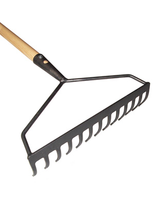 Csúcsminőségű acélból kovácsolt, a fogsor két szélén rögzített, 34 cm széles alap gereblye.